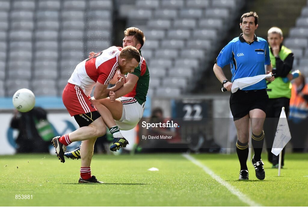 13 April 2014; Fergal Doherty, Derry, tackles Aidan O'Shea, Mayo. Allianz Football League Division 1 Semi-Final, Derry v Mayo, Croke Park, Dublin. Picture credit: David Maher / SPORTSFILE