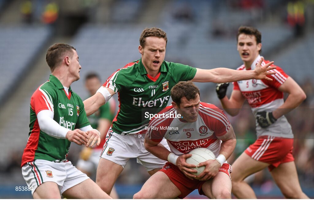 13 April 2014; Patsy Bradley, Derry, in action against Mickey Sweeney, left, and Andy Moran, Mayo. Allianz Football League Division 1 Semi-Final, Derry v Mayo, Croke Park, Dublin. Picture credit: Ray McManus / SPORTSFILE