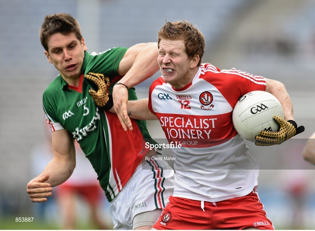 13 April 2014; Enda Lynn, Derry, in action against Lee Keegan, Mayo. Allianz Football League Division 1 Semi-Final, Derry v Mayo, Croke Park, Dublin. Picture credit: David Maher / SPORTSFILE