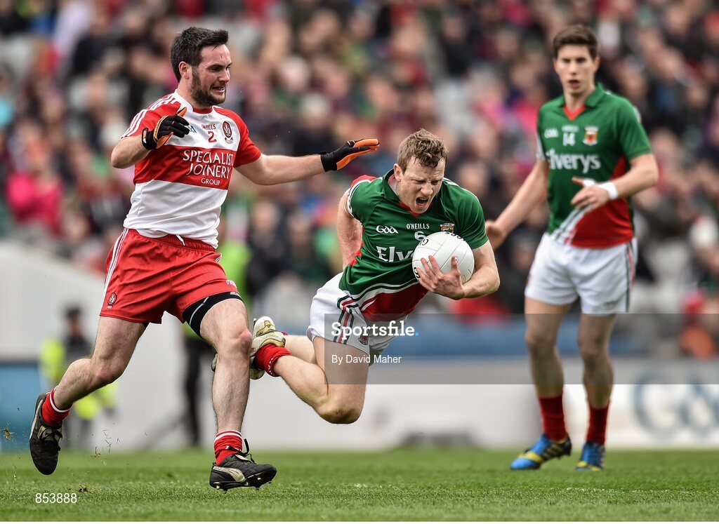 13 April 2014; Colm Boyle, Mayo, in action against Oisin Duffy, Derry. Allianz Football League Division 1 Semi-Final, Derry v Mayo, Croke Park, Dublin. Picture credit: David Maher / SPORTSFILE