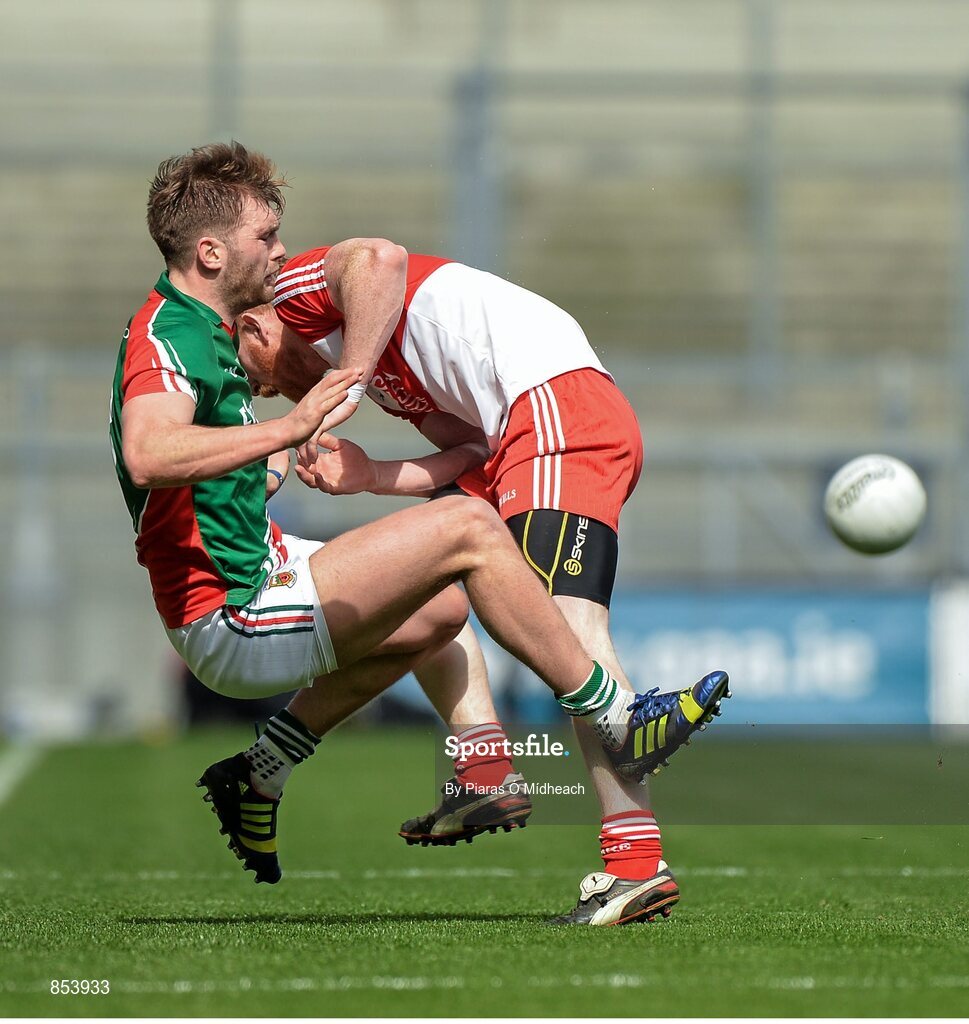 13 April 2014; Fergal Doherty, Derry, fouls Aidan O'Shea, Mayo, which resulted in Doherty being sent off for a second yellow card offence. Allianz Football League Division 1 Semi-Final, Derry v Mayo, Croke Park, Dublin. Picture credit: Piaras Ó Mídheach / SPORTSFILE