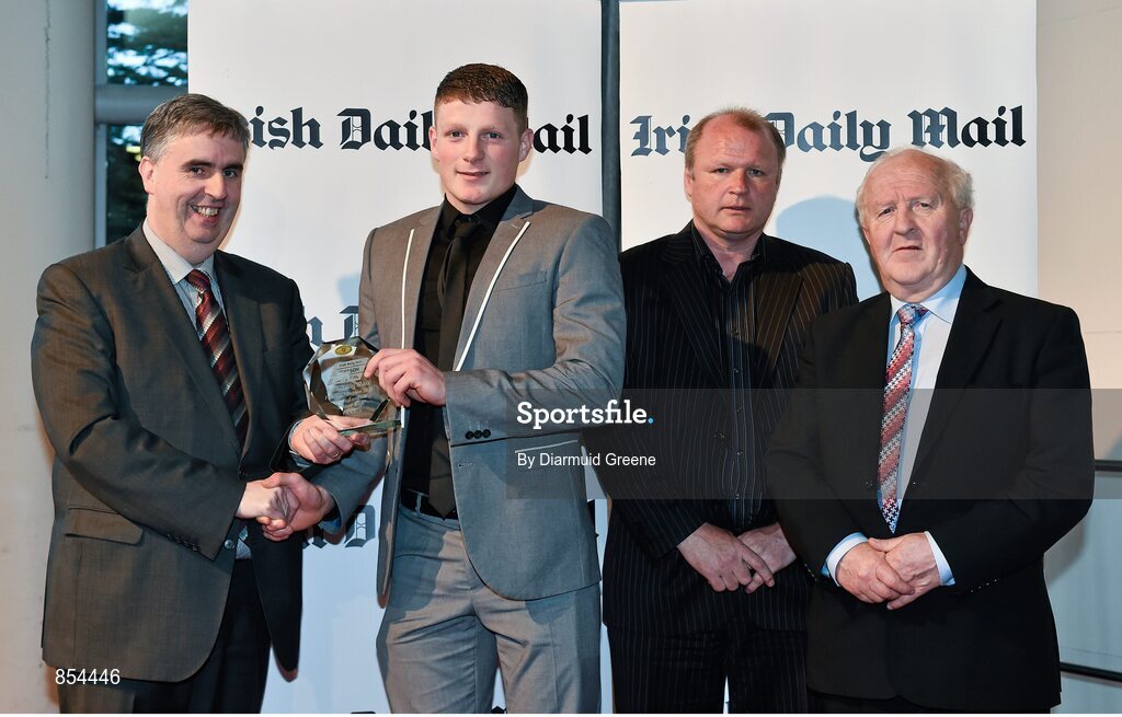 14 April 2014; Conor Cox, UCC and Kerry footballer, is presented with his Irish Daily Mail Future Champions Award award by, from left to right, Gerry Tully, Chairman Comhairle Ardoideachais, Teddy McCarthy, former Cork dual star and Irish Daily Mail columnist, and Robert Frost, Munster Council Chairman. Irish Daily Mail Future Champions Awards 2014, Devere Hall, UCC Student Centre, UCC, Cork. Picture credit: Diarmuid Greene / SPORTSFILE