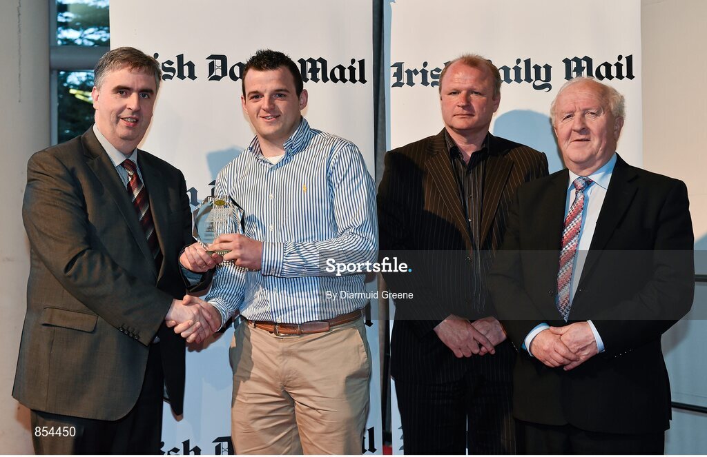 14 April 2014; Alan Dempsey, LIT and Limerick hurler, is presented with his Irish Daily Mail Future Champions Award award by, from left to right, Gerry Tully, Chairman Comhairle Ardoideachais, Teddy McCarthy, former Cork dual star and Irish Daily Mail columnist, and Robert Frost, Munster Council Chairman. Irish Daily Mail Future Champions Awards 2014, Devere Hall, UCC Student Centre, UCC, Cork. Picture credit: Diarmuid Greene / SPORTSFILE