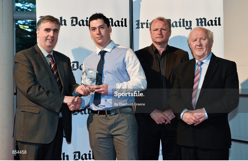14 April 2014; John O'Dwyer, CIT and Tipperary hurler, is presented with his Irish Daily Mail Future Champions Award award by, from left to right, Gerry Tully, Chairman Comhairle Ardoideachais, Teddy McCarthy, former Cork dual star and Irish Daily Mail columnist, and Robert Frost, Munster Council Chairman. Irish Daily Mail Future Champions Awards 2014, Devere Hall, UCC Student Centre, UCC, Cork. Picture credit: Diarmuid Greene / SPORTSFILE