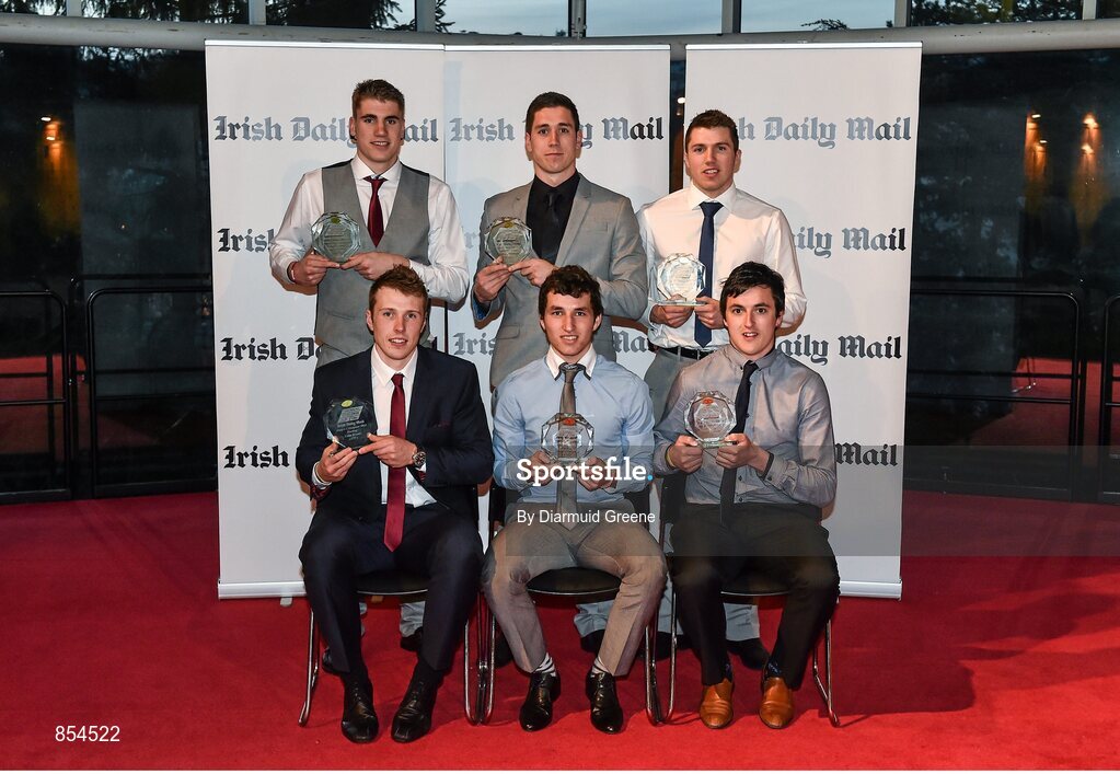 14 April 2014; Irish Daily Mail Future Champions Award winners, all from Cork, top row, footballers Ian Maguire, left, Conor Dorman, centre, and Tom Clancy. Front row, hurlers Eoin Keane, left, Tomas Lawrence, centre, and John Cronin. Irish Daily Mail Future Champions Awards 2014, Devere Hall, UCC Student Centre, UCC, Cork. Picture credit: Diarmuid Greene / SPORTSFILE