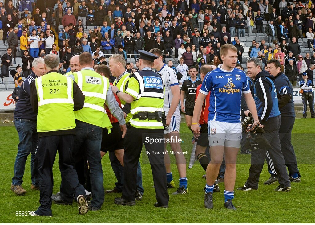 19 April 2014; Referee Derek O'Mahoney is escorted off the field after the game, surrounded by protestations from Cavan players, officials and fans. Cadbury GAA Football U21 Championship Semi-Final, Cavan v Dublin, O'Moore Park, Portlaoise, Co. Laois. Picture credit: Piaras Ó Mídheach / SPORTSFILE
