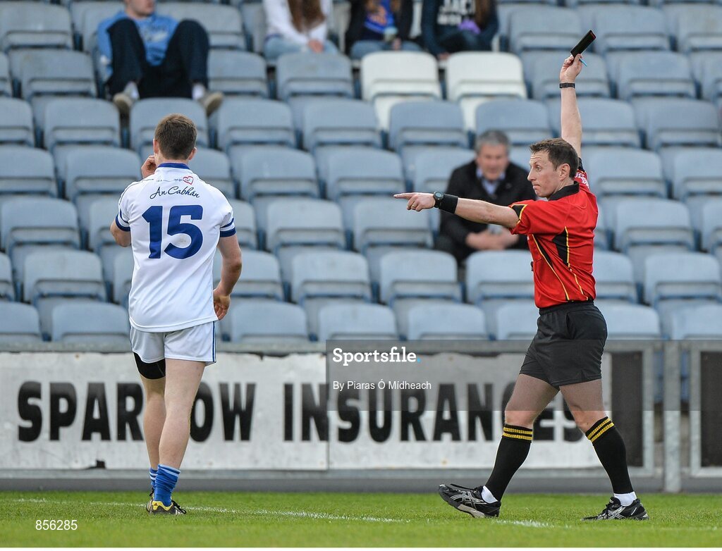 19 April 2014; Joe Dillion, Cavan, leaves the field after being shown a black card by referee Derek O'Mahoney. Cadbury GAA Football U21 Championship Semi-Final, Cavan v Dublin, O'Moore Park, Portlaoise, Co. Laois. Picture credit: Piaras Ó Mídheach / SPORTSFILE