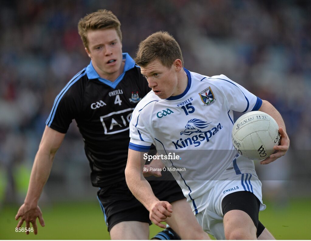 19 April 2014; Joe Dillion, Cavan, in action against Robert McDaid, Dublin. Cadbury GAA Football U21 Championship Semi-Final, Cavan v Dublin, O'Moore Park, Portlaoise, Co. Laois. Picture credit: Piaras Ó Mídheach / SPORTSFILE