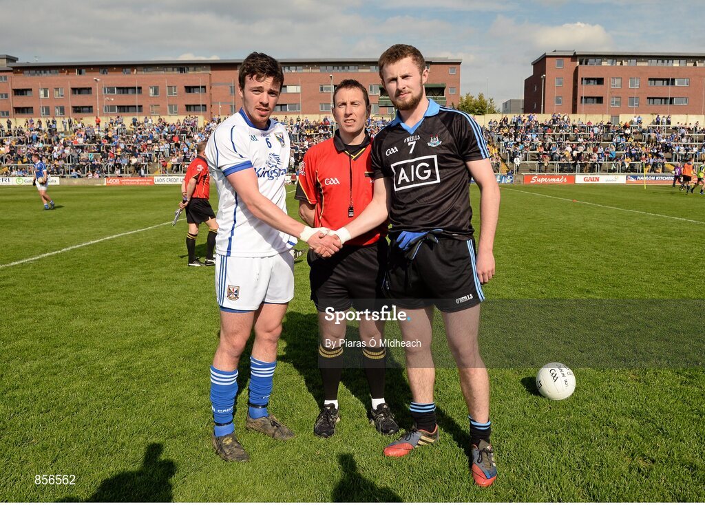 19 April 2014; Team captains Conor P. Moynagh, left, Cavan, and Jack McCaffrey, Dublin, shake hands in the company of referee Derek O'Mahoney. Cadbury GAA Football U21 Championship Semi-Final, Cavan v Dublin, O'Moore Park, Portlaoise, Co. Laois. Picture credit: Piaras Ó Mídheach / SPORTSFILE