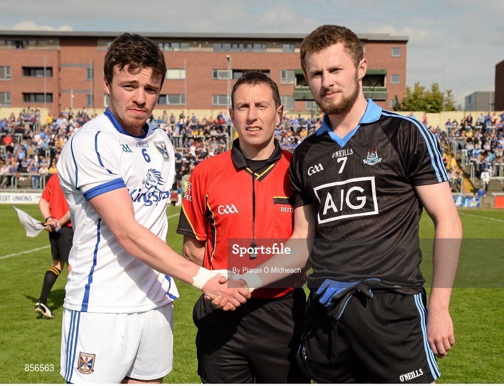 19 April 2014; Team captains Conor P. Moynagh, left, Cavan, and Jack McCaffrey, Dublin, shake hands in the company of referee Derek O'Mahoney. Cadbury GAA Football U21 Championship Semi-Final, Cavan v Dublin, O'Moore Park, Portlaoise, Co. Laois. Picture credit: Piaras Ó Mídheach / SPORTSFILE