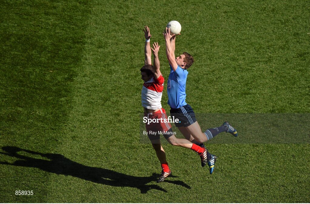 27 April 2014; Kevin Nolan, Dublin, in action against Benny Heron, Derry. Allianz Football League Division 1 Final, Dublin v Derry, Croke Park, Dublin. Picture credit: Ray McManus / SPORTSFILE