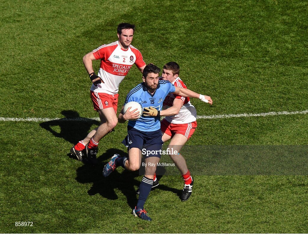 27 April 2014; Bernard Borgan, Dublin, in action against Ciarán McFaul, right, and Oisín Duffy, Derry. Allianz Football League Division 1 Final, Dublin v Derry, Croke Park, Dublin. Picture credit: Ray McManus / SPORTSFILE
