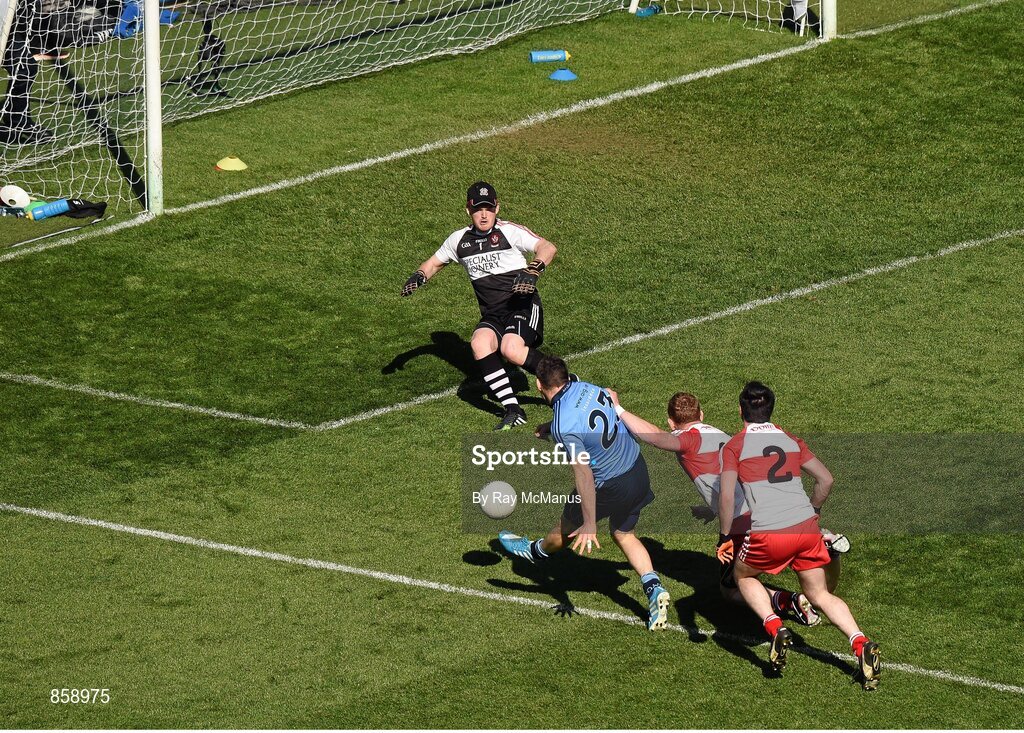 27 April 2014; Kevin McManamon, Dublin, under pressure from Fergal Doherty and Oisín Duffy, Derry, shoots past Thomas Mallon and wide in the thirtythird minute. Allianz Football League Division 1 Final, Dublin v Derry, Croke Park, Dublin. Picture credit: Ray McManus / SPORTSFILE