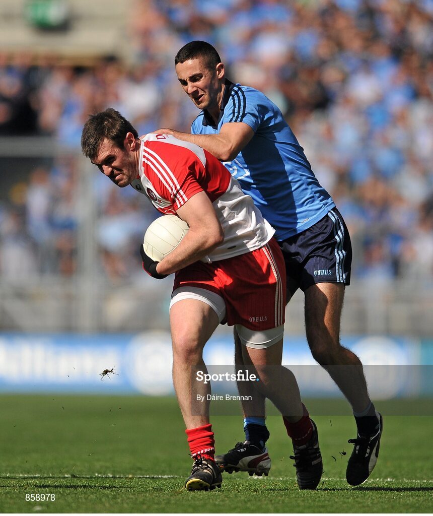 27 April 2014; Mark Lynch, Derry, in action against James McCarthy, Dublin. Allianz Football League Division 1 Final, Dublin v Derry, Croke Park, Dublin. Picture credit: Dáire Brennan / SPORTSFILE