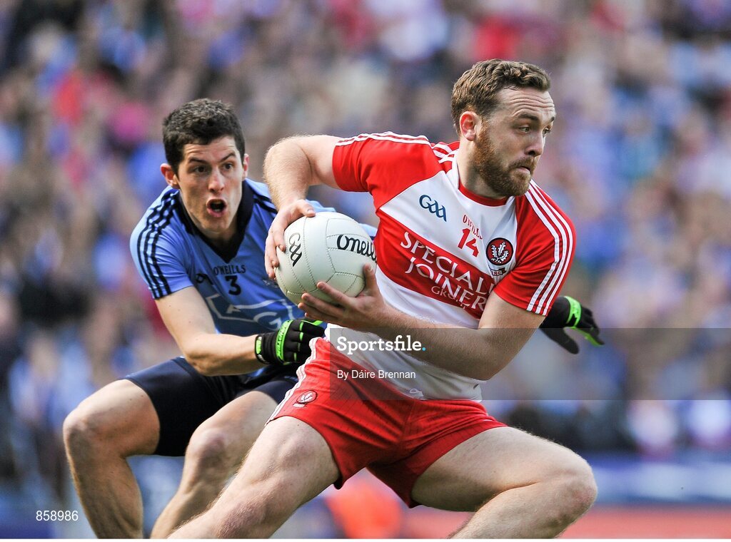 27 April 2014; Emmett McGuckin, Derry, in action against Rory O'Carroll, Dublin. Allianz Football League Division 1 Final, Dublin v Derry, Croke Park, Dublin. Picture credit: Dáire Brennan / SPORTSFILE