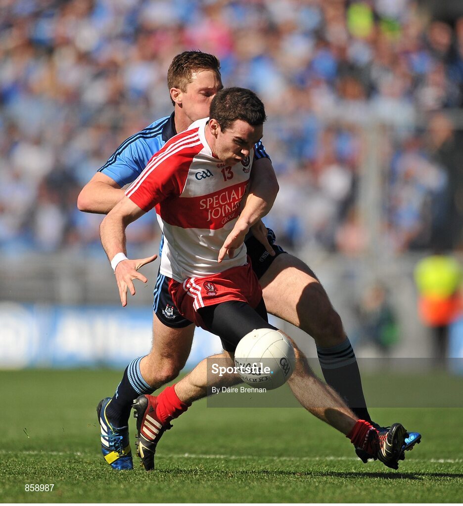27 April 2014; Benny Heron, Derry, in action against Kevin Nolan, Dublin. Allianz Football League Division 1 Final, Dublin v Derry, Croke Park, Dublin. Picture credit: Dáire Brennan / SPORTSFILE