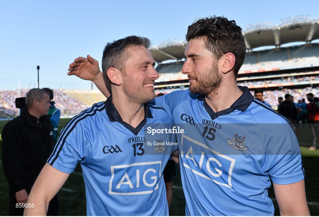 27 April 2014; Alan Brogan, left, Dublin, celebrates with his brother Bernard at the end of the game. Allianz Football League Division 1 Final, Dublin v Derry, Croke Park, Dublin. Picture credit: David Maher / SPORTSFILE