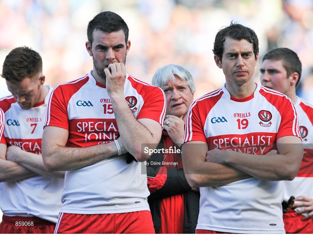 27 April 2014; Derry manager Brian McIver looks at the cup presentation from behind Cailean O'Boyle, left, and Charlie Kielt after the game. Allianz Football League Division 1 Final, Dublin v Derry, Croke Park, Dublin. Picture credit: Dáire Brennan / SPORTSFILE