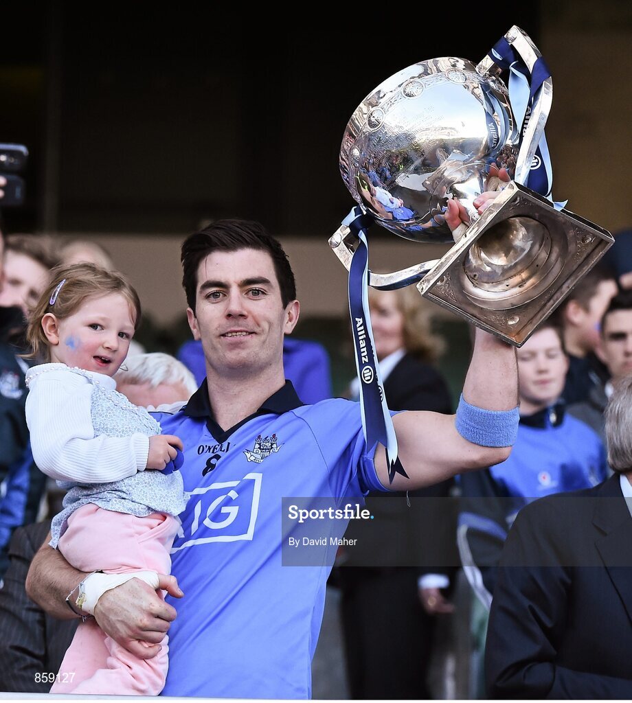 27 April 2014; Michael Darragh MacAuley, Dublin, celebrates by lifting the cup at the end of the game with his niece Rebecca Sheridan, age 3. Allianz Football League Division 1 Final, Dublin v Derry, Croke Park, Dublin. Picture credit: David Maher / SPORTSFILE