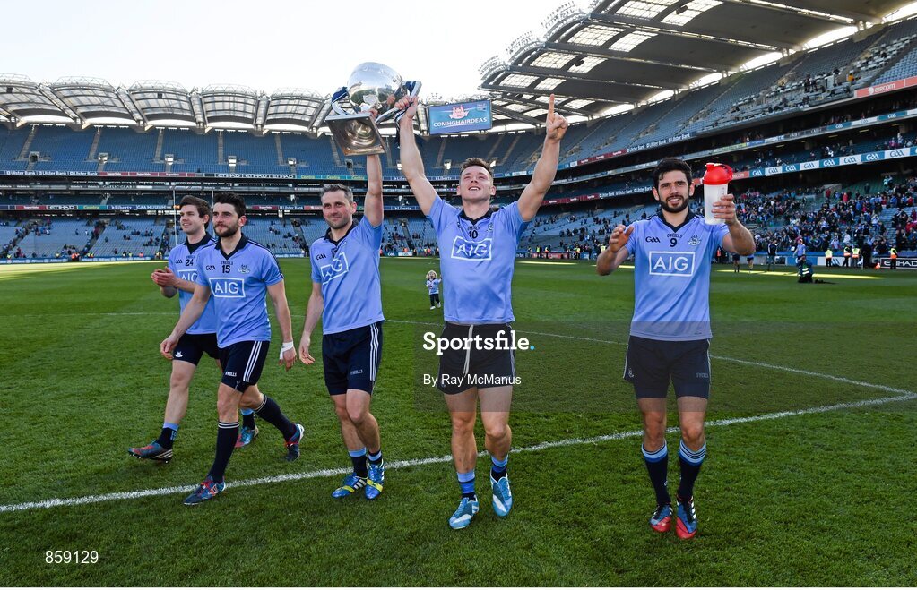 27 April 2014; Dublin players, Darragh Nelson, Bernard and Alan Brogan, Paul Flynn and Cian O'Sullivan, celebrate with the cup after the game. Allianz Football League Division 1 Final, Dublin v Derry, Croke Park, Dublin. Picture credit: Ray McManus / SPORTSFILE