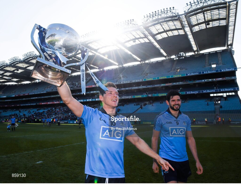 27 April 2014; Dublin players, Paul Flynn and Cian O'Sullivan, celebrate with the cup after the game. Allianz Football League Division 1 Final, Dublin v Derry, Croke Park, Dublin. Picture credit: Ray McManus / SPORTSFILE