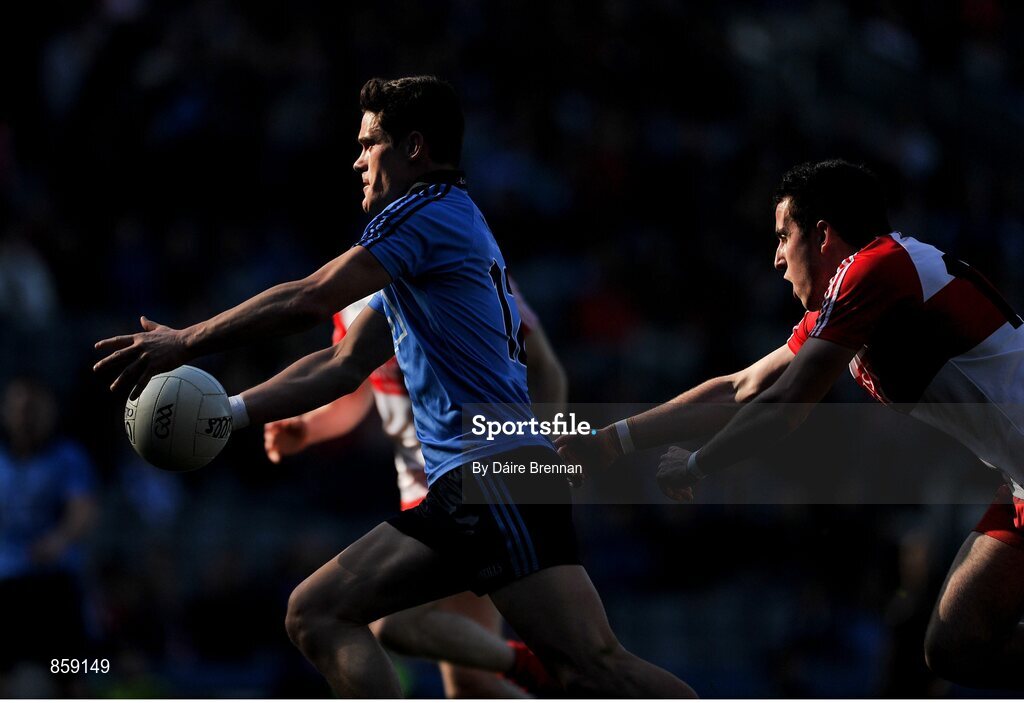27 April 2014; Diarmuid Connolly, Dublin, on his way to scoring his side's third goal, despite the challenge of Declan Brown, Derry. Allianz Football League Division 1 Final, Dublin v Derry, Croke Park, Dublin. Picture credit: Dáire Brennan / SPORTSFILE