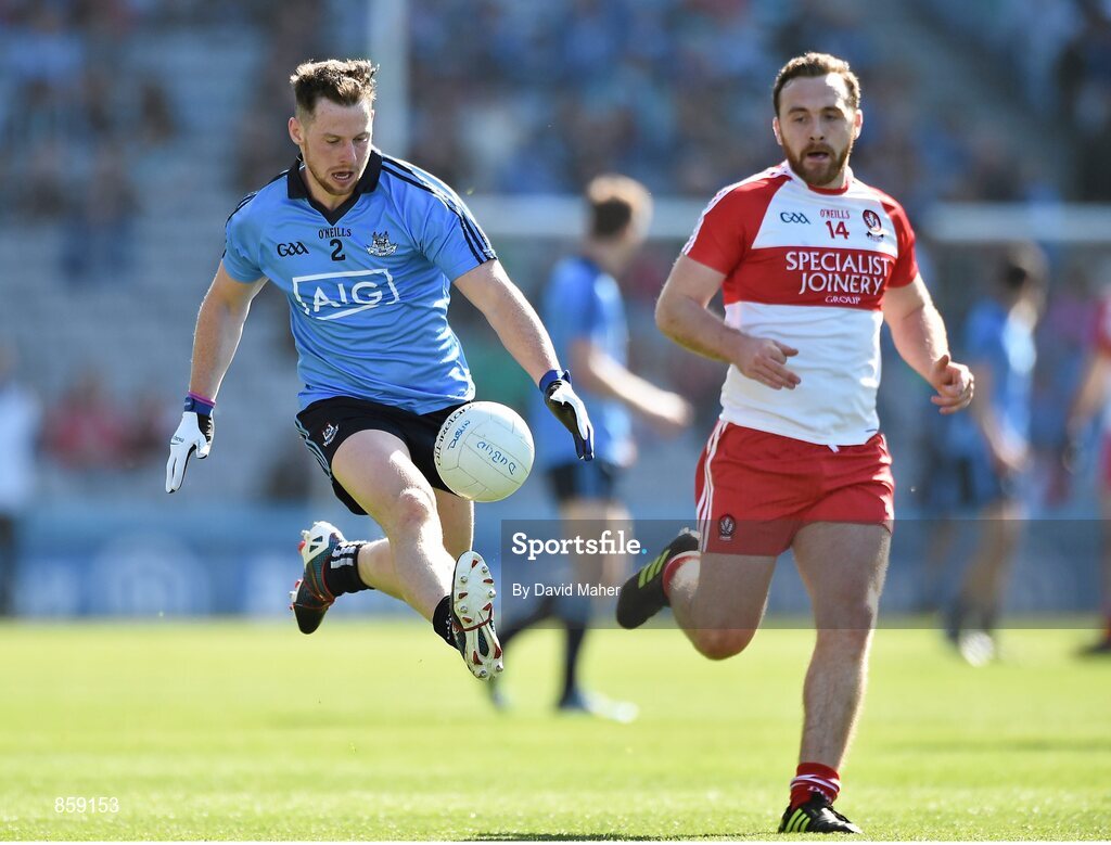 27 April 2014; Philly McMahon, Dublin, in action against Emmett McGuckin, Derry. Allianz Football League Division 1 Final, Dublin v Derry, Croke Park, Dublin. Picture credit: David Maher / SPORTSFILE