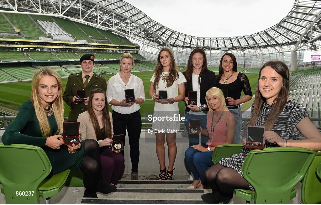 30 April 2014; Winners of the Bus Eireann Women's National League Team of the Year for the 2013-14 season, from left, Julie Ann Russell, Peamount United, Sinead Taylor, Galway, Niamh Reid, Raheny United, Lynsey McKey, Galway, Emma Hansberry, Castlebar Celtic, Jessica Glesson, Wexford Youths Women, Stephanie Roche, Peamount United, Aine O'Gorman, Peamount United, and Ciara Grant, Raheny United. Bus Eireann Women’s National League Awards, Aviva Stadium, Lansdowne Road, Dublin. Picture credit: David Maher / SPORTSFILE
