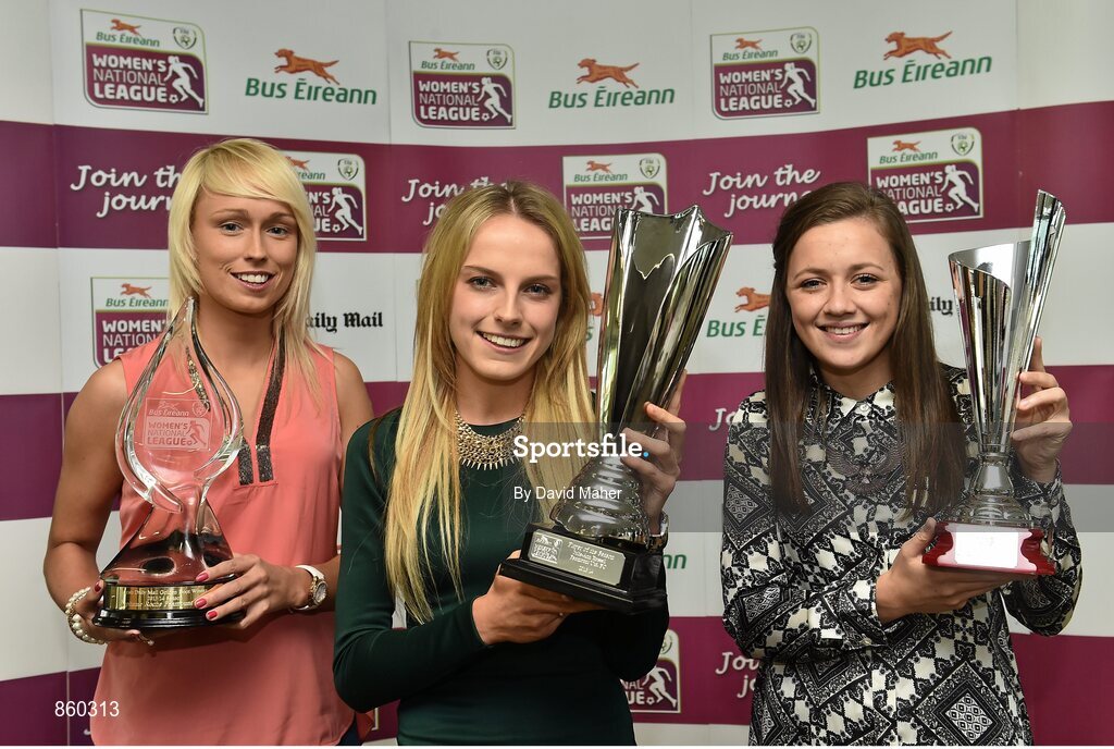 30 April 2014; Winners at the Bus Eireann Women’s National League Awards, from left, Stephanie Roche, Peamount United, winner of the Irish Daily Mail Golden Boot Award, Julie Ann Russell, Peamount United, winner of the Bus Eireann Women’s National League Player of the Year Award, and Katie McCabe, Raheny United, winner of the Bus Eireann Women’s National League Young Player of the Year Award. Bus Eireann Women’s National League Awards, Aviva Stadium, Lansdowne Road, Dublin. Picture credit: David Maher / SPORTSFILE