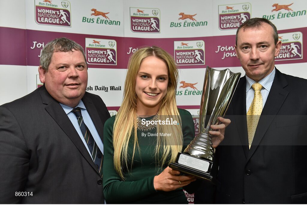 30 April 2014; Julie Ann Russell, Peamount United, is presented with the Bus Eireann Women’s National League Player of the Year Award by Eamon Naughton, left, Chairman of the SSE Airtricity League, and Martin Nolan, Chief Executive of Bus Eireann. Bus Eireann Women’s National League Awards, Aviva Stadium, Lansdowne Road, Dublin. Picture credit: David Maher / SPORTSFILE