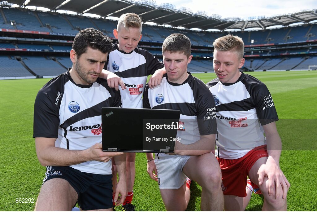 6 May 2014; The Gaelic Athletic Association (GAA), Gaelic Players Association (GPA), the Camogie Associaition and the Ladies Gaelic Football Association (LGFA) are united today to announce the launch of the Lenovo GAA Skills Hubs, offering the chance for boys and girls aged between 13 to 15 years of age to learn the skills of Gaelic football, hurling and camogie from their heroes and heroines, in high quality venues across the country from June to August this summer. Pictured at the launch are, from left to right, Dublin footballer Bernard Brogan, Cork hurler Adam McGuirk, Conor Lehane and Johnny McGuirk. Croke Park, Dublin. Picture credit: Ramsey Cardy / SPORTSFILE