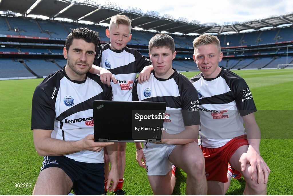 6 May 2014; The Gaelic Athletic Association (GAA), Gaelic Players Association (GPA), the Camogie Associaition and the Ladies Gaelic Football Association (LGFA) are united today to announce the launch of the Lenovo GAA Skills Hubs, offering the chance for boys and girls aged between 13 to 15 years of age to learn the skills of Gaelic football, hurling and camogie from their heroes and heroines, in high quality venues across the country from June to August this summer. Pictured at the launch are, from left to right, Dublin footballer Bernard Brogan, Cork hurler Adam McGuirk, Conor Lehane and Johnny McGuirk. Croke Park, Dublin. Picture credit: Ramsey Cardy / SPORTSFILE