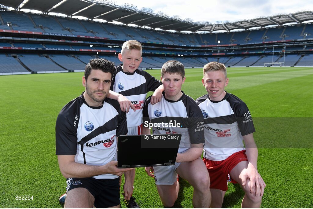 6 May 2014; The Gaelic Athletic Association (GAA), Gaelic Players Association (GPA), the Camogie Associaition and the Ladies Gaelic Football Association (LGFA) are united today to announce the launch of the Lenovo GAA Skills Hubs, offering the chance for boys and girls aged between 13 to 15 years of age to learn the skills of Gaelic football, hurling and camogie from their heroes and heroines, in high quality venues across the country from June to August this summer. Pictured at the launch are, from left to right, Dublin footballer Bernard Brogan, Cork hurler Adam McGuirk, Conor Lehane and Johnny McGuirk. Croke Park, Dublin. Picture credit: Ramsey Cardy / SPORTSFILE