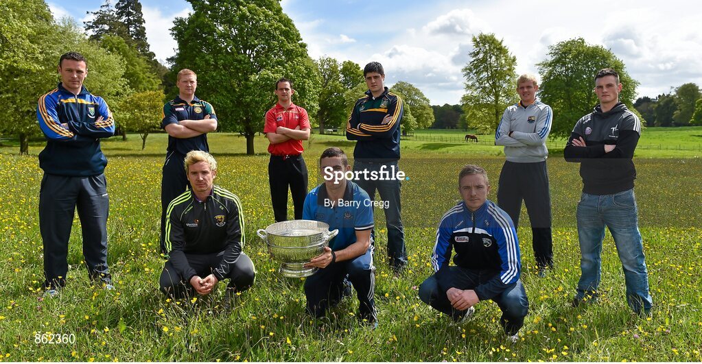 6 May 2014; Senior footballers, back row, from left to right, Leighton Glynn, Wicklow, Alan Mulhall, Offaly, Shane Lennon, Louth, Conor Gillespie, Meath, Patrick Collum, Longford and Eoin Doyle, Kildare. Front row, from left to right, Ben Brosnan, Wexford, James McCarthy, Dublin, and Ross Munnelly, Laois, in attendance at the launch of the Leinster Senior Championships 2014. Farmleigh House, Dublin. Picture credit: Barry Cregg / SPORTSFILE