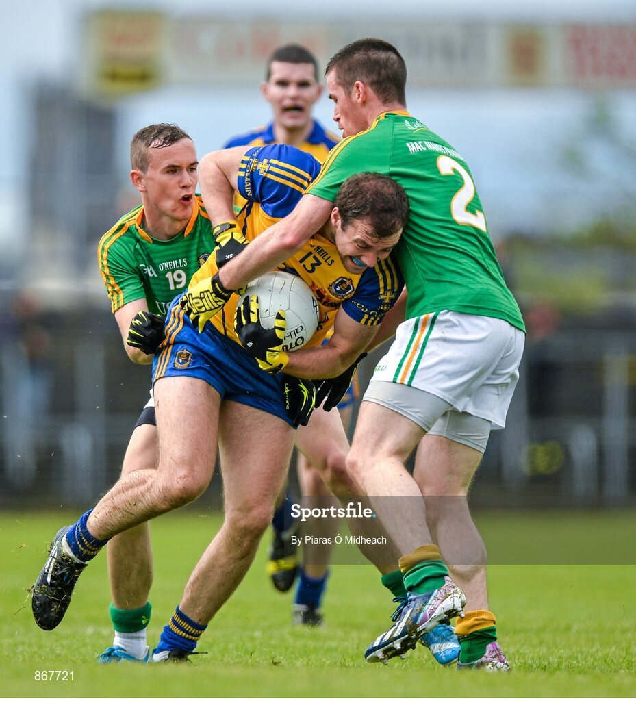 18 May 2014; Senan Kilbride, Roscommon, in action against Michael McWeeney, left, and Barry Prior, 2, Leitrim. Connacht GAA Football Senior Championship Quarter-Final, Roscommon v Leitrim, Dr. Hyde Park, Roscommon. Picture credit: Piaras Ó Mídheach / SPORTSFILE
