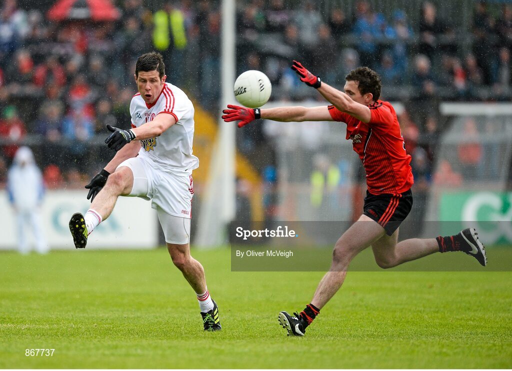18 May 2014; Sean Cavanagh, Tyrone, in action against Declan Rooney, Down. Ulster GAA Football Senior Championship Preliminary Round, Tyrone v Down, Healy Park, Omagh, Co. Tyrone. Picture credit: Oliver McVeigh / SPORTSFILE