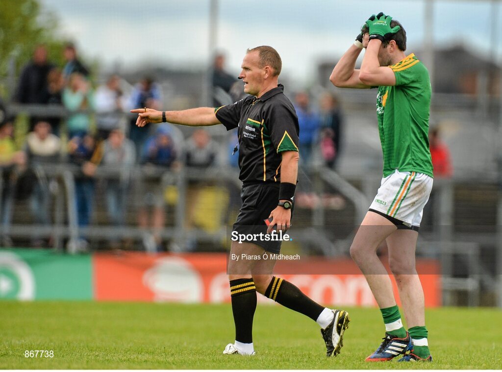 18 May 2014; Darren Sweeney, Leitrim, leaves the field after being shown a black card by referee Conor Lane. Connacht GAA Football Senior Championship Quarter-Final, Roscommon v Leitrim, Dr. Hyde Park, Roscommon. Picture credit: Piaras Ó Mídheach / SPORTSFILE