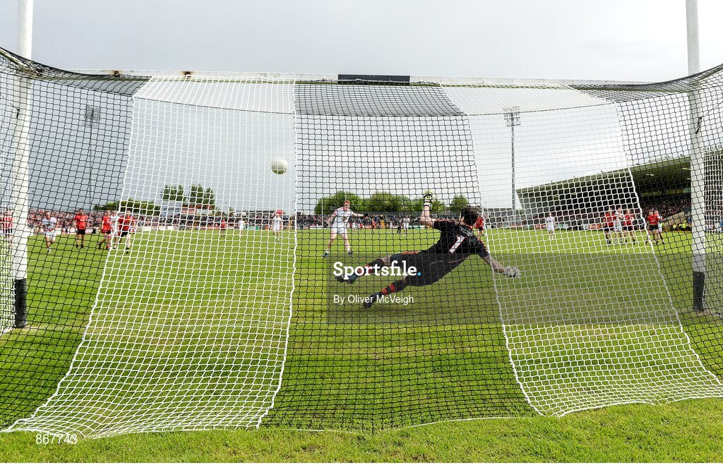 18 May 2014; Peter Harte, Tyrone, sends Brendan McVeigh, Down, the wrong way with a penalty for his side's first goal. Ulster GAA Football Senior Championship Preliminary Round, Tyrone v Down, Healy Park, Omagh, Co. Tyrone. Picture credit: Oliver McVeigh / SPORTSFILE