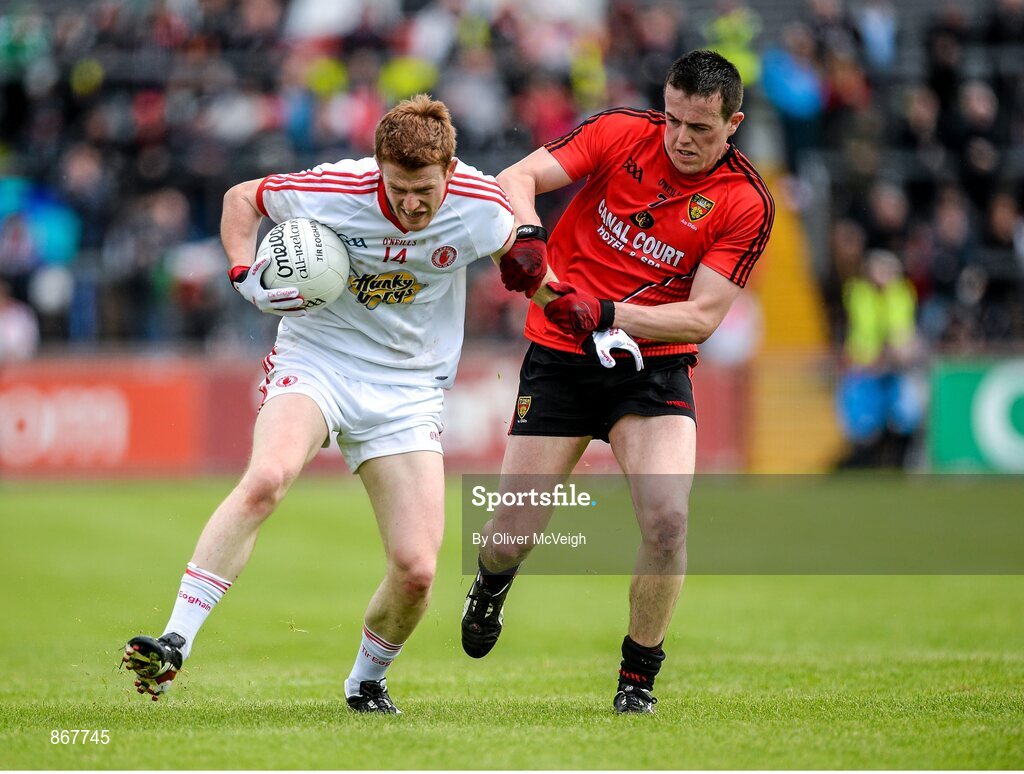 18 May 2014; Niall McKenna, Tyrone, in action against Conor Garvey, Down. Ulster GAA Football Senior Championship Preliminary Round, Tyrone v Down, Healy Park, Omagh, Co. Tyrone. Picture credit: Oliver McVeigh / SPORTSFILE