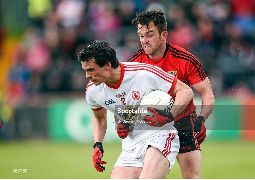 18 May 2014; Aidan McCrory, Tyrone, in action against Mark Poland, Down. Ulster GAA Football Senior Championship Preliminary Round, Tyrone v Down. Healy Park, Omagh, Co. Tyrone. Picture credit: Stephen McCarthy / SPORTSFILE