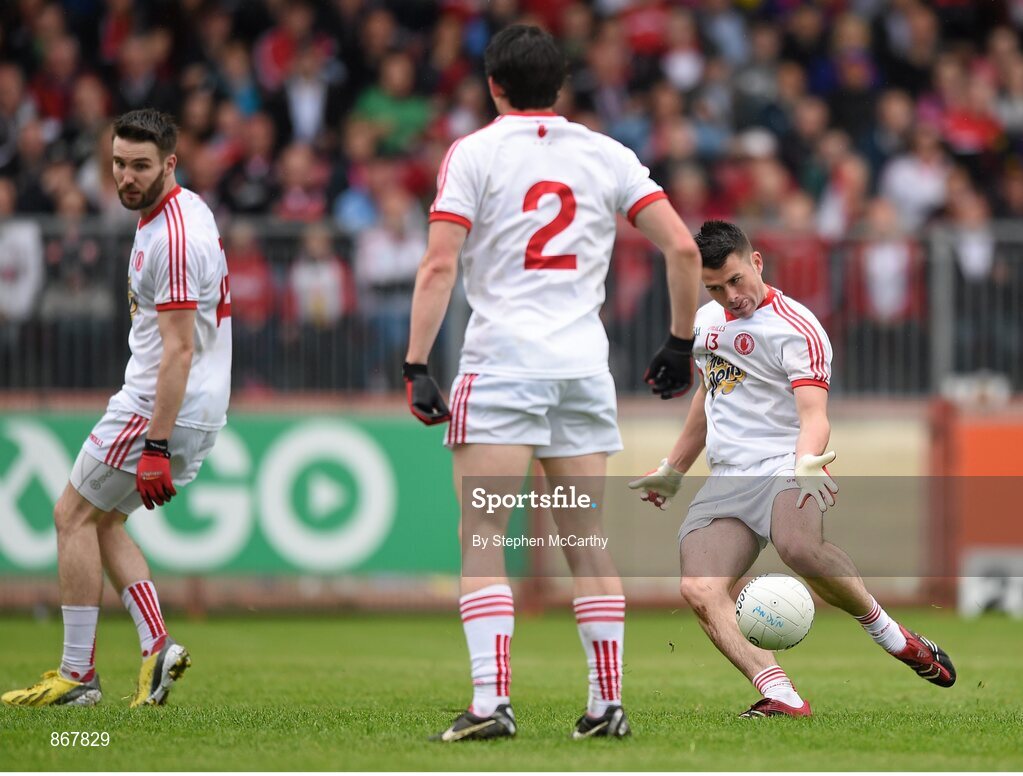 18 May 2014; Darren McCurry, Tyrone, shoots to score his side's second goal. Ulster GAA Football Senior Championship Preliminary Round, Tyrone v Down. Healy Park, Omagh, Co. Tyrone. Picture credit: Stephen McCarthy / SPORTSFILE