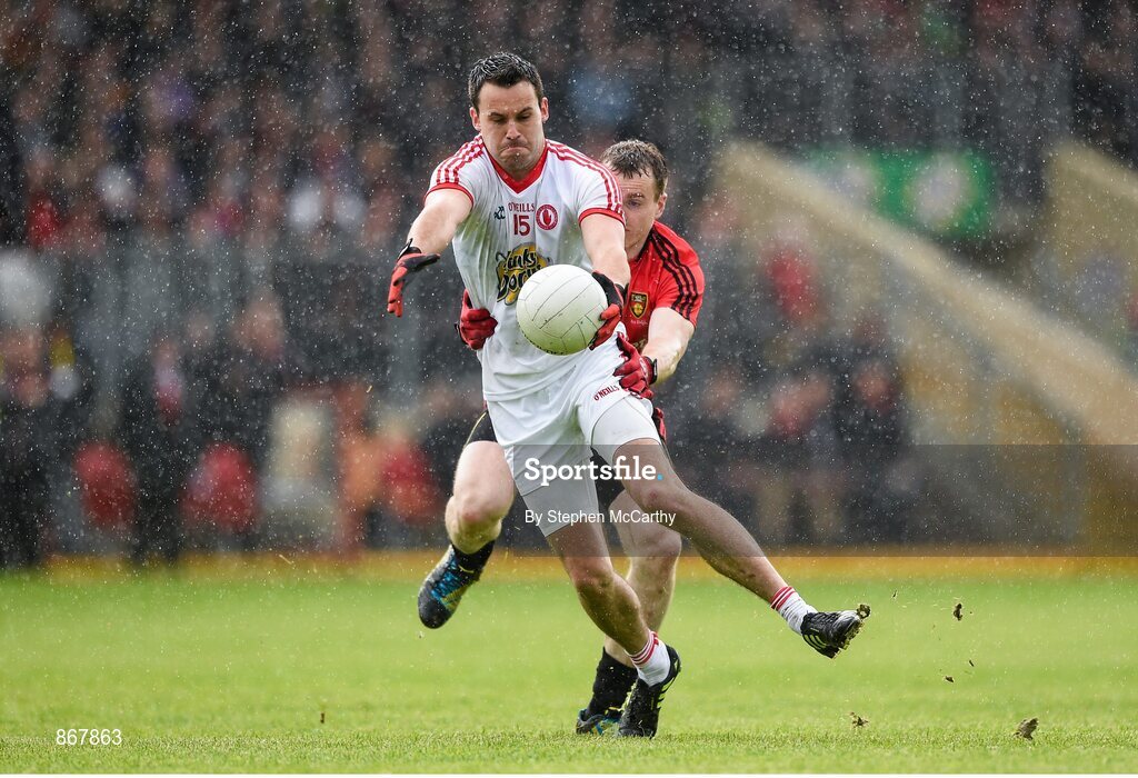 18 May 2014; Kyle Coney, Tyrone, in action against Brendan McArdle, Down. Ulster GAA Football Senior Championship Preliminary Round, Tyrone v Down. Healy Park, Omagh, Co. Tyrone. Picture credit: Stephen McCarthy / SPORTSFILE