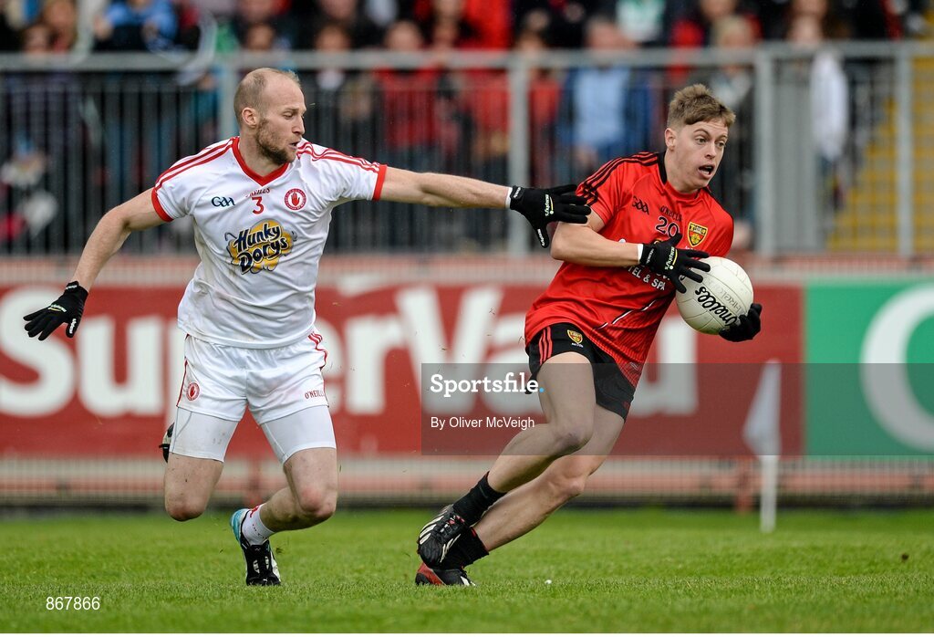 18 May 2014; Jerome Johnston, Down, in action against Danny McBride, Tyrone. Ulster GAA Football Senior Championship Preliminary Round, Tyrone v Down, Healy Park, Omagh, Co. Tyrone. Picture credit: Oliver McVeigh / SPORTSFILE