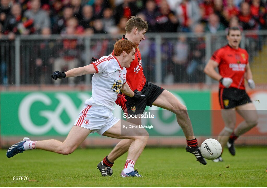 18 May 2014; Conor Maginn, Down, shoots to score his side's third goal despite the efforts of Peter Harte, Tyrone. Ulster GAA Football Senior Championship Preliminary Round, Tyrone v Down, Healy Park, Omagh, Co. Tyrone. Picture credit: Oliver McVeigh / SPORTSFILE