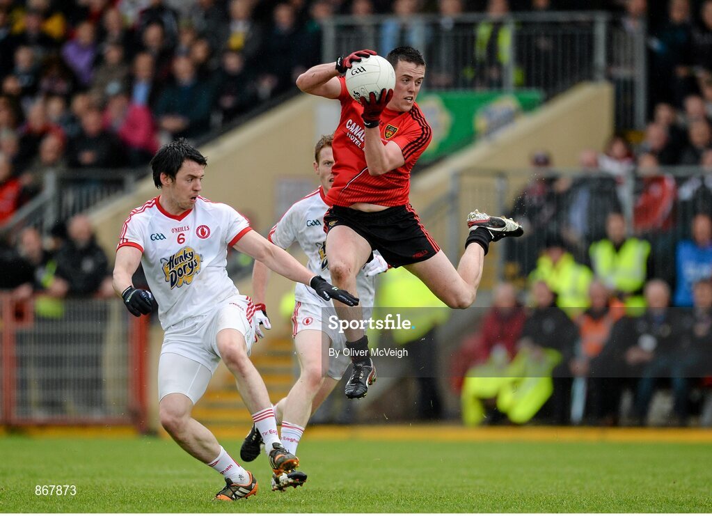 18 May 2014; Conor Garvey, Down, in action against Mattie Donnelly and Niall McKenna, Tyrone. Ulster GAA Football Senior Championship Preliminary Round, Tyrone v Down, Healy Park, Omagh, Co. Tyrone. Picture credit: Oliver McVeigh / SPORTSFILE
