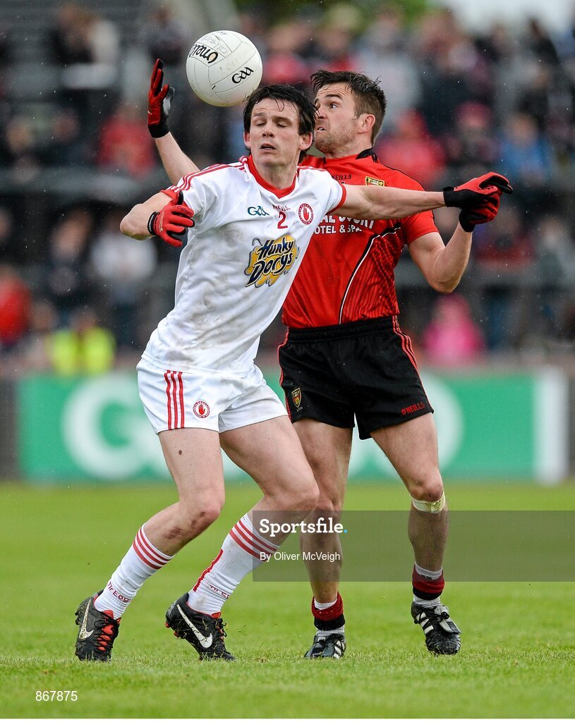 18 May 2014; Mark Poland, Down, in action against Aidan McCrory, Tyrone. Ulster GAA Football Senior Championship Preliminary Round, Tyrone v Down, Healy Park, Omagh, Co. Tyrone. Picture credit: Oliver McVeigh / SPORTSFILE