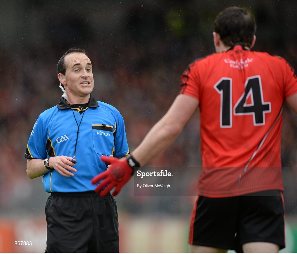 18 May 2014; Referee David Coldrick chats to Niall Madine, Down. Ulster GAA Football Senior Championship Preliminary Round, Tyrone v Down, Healy Park, Omagh, Co. Tyrone. Picture credit: Oliver McVeigh / SPORTSFILE