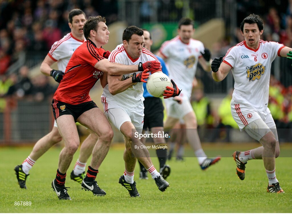 18 May 2014; Kyle Coney, Tyrone, in action against Declan Rooney, Down. Ulster GAA Football Senior Championship Preliminary Round, Tyrone v Down, Healy Park, Omagh, Co. Tyrone. Picture credit: Oliver McVeigh / SPORTSFILE