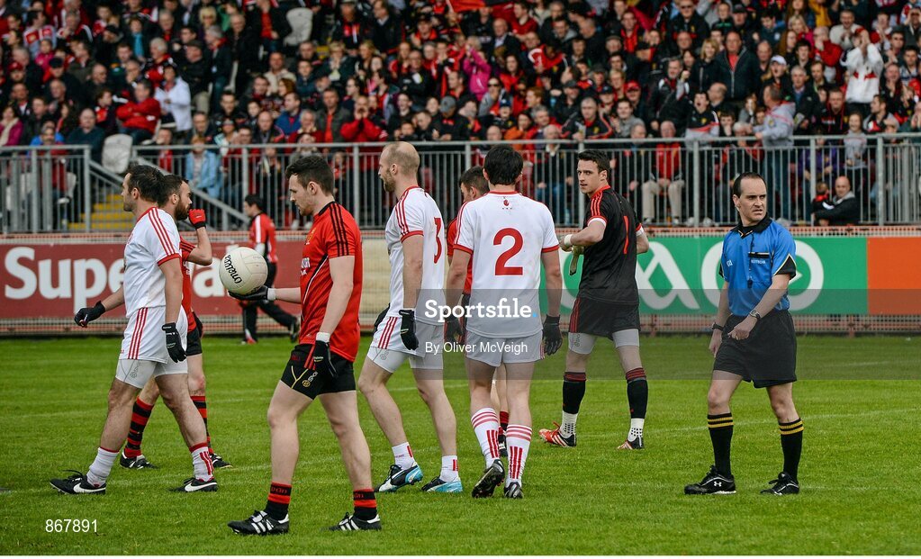 18 May 2014; Tyrone goalkeeper Niall Morgan, second from right, looks back after receiving a black card by Referee David Coldrick. Ulster GAA Football Senior Championship Preliminary Round, Tyrone v Down, Healy Park, Omagh, Co. Tyrone. Picture credit: Oliver McVeigh / SPORTSFILE