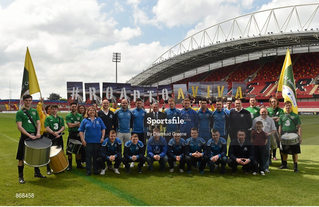 20 May 2014; Former Republic of Ireland international Ray Houghton, holding the FAI Junior Cup, along with players and members of Ballynanty Rovers AFC during the FAI Junior Cup Aviva Communities Day ahead of Sunday's Final at the Aviva Stadium. Thomond Park, Limerick. Picture credit: Diarmuid Greene / SPORTSFILE